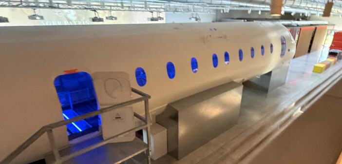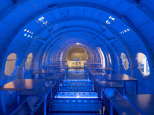 Il vecchio capannone centrale è stato riqualificato per diventare un’area modulare open space ispirata agli aeroporti, orientata al concetto di “innovazione come viaggio”. Gli interni, dal design minimalista tecnologico, includono installazioni scenografiche in una vera carlinga di ATR-42 riutilizzata come sala eventi attrezzata con sistemi digitali integrati. Tutti i servizi sono orchestrati tramite chatbot basati su IA, pensati come assistenti digitali in grado di gestire interazioni vocali o testuali e supportare procedure operative, prenotazioni e configurazione degli spazi tramite smartphone. L’infrastruttura rappresenta un modello avanzato di hospitality 5 stelle orientata al lavoro ibrido, combinando efficienza energetica, tecnologie intelligenti, design modulare e servizi evoluti, diventando un riferimento per imprese, studenti e professionisti impegnati in percorsi di crescita e innovazione.