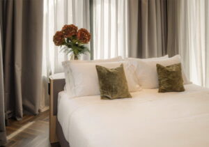 A Mogliano Veneto (perla del Terraglio e conosciuta come città delle ville del’500, luogo di residenza per artisti come Giuseppe Verdi che lì vi riscrisse La Traviata e zona di produzione della antica pesca a polpa bianca e nocciolo color fragola, con cui si fa il cocktail Bellini; anche famosa per il radicchio rosso di Treviso e per l’asparago bianco di Badoere) cittadina sita sull’antica strada napoleonica che collega Treviso a Venezia; lì si trova il The Foscarini, villa seicentesca appartenuta alla omonima nobile famiglia, restaurata con cura per conservarne fascino, charme, giardini secolari e camere con travi a vista. È l’albergo affine al The Castelletto, governato alla stessa maniera, ma destinato ad ospitare target meno “business”, più giovane e sportivo (ideale per i bikers della “gravel”…) ma pur sempre in un ambiente classico con quadri, lampadari, tappeti di classe, ma anche con palestra, sauna (corner lavanderia con annessa stireria). Anche per gli alberghi è importante la pulizia degli ambienti che segue la filosofia della sostenibilità, per esempio: l’uso di solo efficaci detersivi biodegradabili, che proteggono sia le superfici che l’ecosistema. È un modo di prendersi cura del territorio, efficace e mai aggressivo.