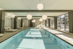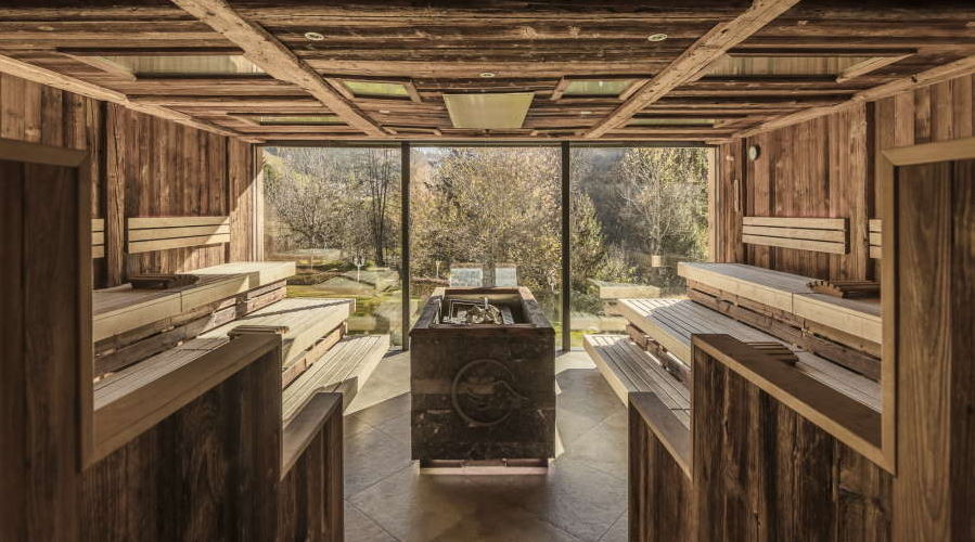 Il cuore del relax è l’area wellness di 2.500 metri quadrati: piscine interne ed esterne riscaldate, vasche idromassaggio, area saune panoramiche, bagno turco, percorsi Kneipp, zone relax con camino e rituali quotidiani di gettate di vapore. Un vero e proprio spazio rigenerativo pensato per il recupero fisico e mentale dopo una giornata all’aria aperta.