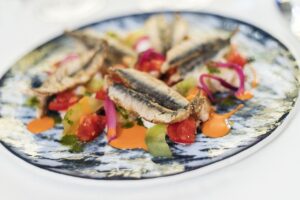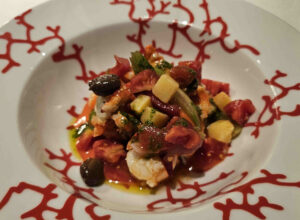 Riguardo al primo piatto ho voluto fare dei Gnocchi di patate perché almeno una volta all’anno gli gnocchi entrano in carta, e quest’anno l’abbiamo fatto con dei crostacei preparati alla griglia, con una riduzione di crostacei, la bottarga e una salsa verde delicata che riporta l’affumicato della griglia. E’ stato come giocare con dei classici ma rivisti in modo diverso, senza strafare ma cercando di rendere onore ai piatti. Anche l’Alice in panzanella è un grande classico (nella foto), lo faccio da più di dodici anni e nel periodo estivo ha molto successo perché è sfizioso: c’è un’alice fritta ma condita con una panzanella montata al momento sul piatto.