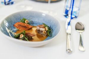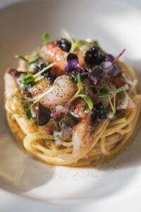 <E’ un gran bel complimento e mi fa molto piacere perché è quello su cui lavoro! Mi dicevi le soddisfazioni… certo, quelle sul volto dei clienti che mi dicono che riesco a cucire insieme i gusti senza sovrapporli… addirittura ho avuto una cliente storica che mi ha detto. “Guarda tu hai una dote innata, sei come un equilibrista, riesci a mettere a cucire insieme i gusti senza mai farli sovrapporre, esasperato e li fai stare nel piatto in un modo magistrale. Sono bilanciati, esaltano il pesce ma ne fanno anche un piatto unico particolare. Quindi te lo dico con grande certezza che è la prima sensazione che ho avuto, la seconda è stata riconfermata e mi pare giusto scriverlo anche”. Sono pignolo, lo ammetto: dico ai ragazzi di assaggiare sempre, di capire se le proporzioni sono giuste. Un pesce con troppo contorno perde importanza, tutto deve essere bilanciato. Credo che questo equilibrio sia il tratto distintivo del mio lavoro>.