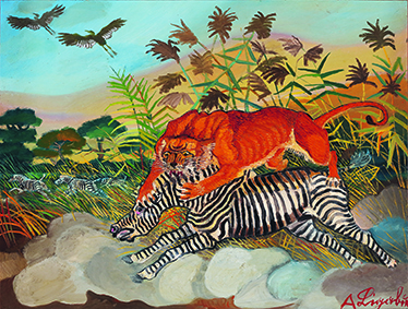Secondo periodo (1939-1952). In questa fase Ligabue padroneggia meglio colore e linea, creando composizioni più complesse e dinamiche. La materia pittorica acquisisce spessore e i toni diventano più caldi. L’artista scopre le diverse tonalità del giallo, che usa frequentemente insieme alla terra di Kassel, al blu di Prussia e al rosso carminio. Egi dipinge senza disegni preparatori, ottenendo figure con una potente espressività grafica.