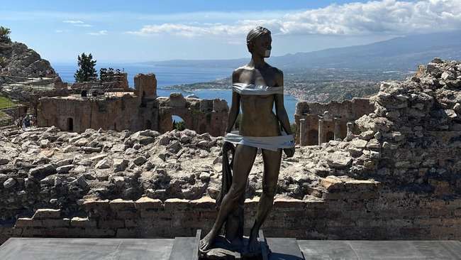 Accanto a questo nucleo, David (2024, bronzo) introduce un nuovo capitolo. La figura femminile, alta 181 cm, collocata sulla sommità delle tribune, guarda verso il mare con un portamento che richiama la tradizione rinascimentale, ma ne ribalta la narrazione. La postura fiera, la fionda e la pietra sono elementi che dialogano con la scultura michelangiolesca, ma declinati in chiave contemporanea. L’opera arriva a Taormina dopo un percorso simbolico a bordo della nave Amerigo Vespucci, che ne ha fatto una sorta di ambasciatrice itinerante dell’arte italiana.