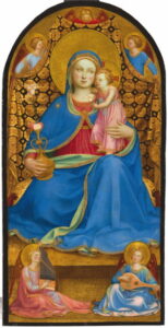 Serafica la Madonna dell’Umiltà e cinque angeli (1425ca.).- tema ripreso più volte dal Nostro – che par quasi la rappresentazione figurata del secondo verso del canto 33° del Paradiso di Dante che di Maria scrive “umile e alta più che creatura”: la Madonna seduta in terra (humus) quale modello della virtù dell’umiltà, ma con un mantello blu di regalità, trattiene il Bimbo che le si accosta alla guancia. In alto tre angeli sorreggono il telo, mentre in basso, uno ha un organetto e l’altro tiene sollevato un plettro sulle corde di un liuto. Par quasi il silenzio che precede l’intonazione dell’Ave Maria incisa sulla passamaneria del manto e sull’aureola così grande da sembrare un vassoio d’ottone in voga all’epoca. Di gusto orientale il vaso con rose e giglio della Vergine.