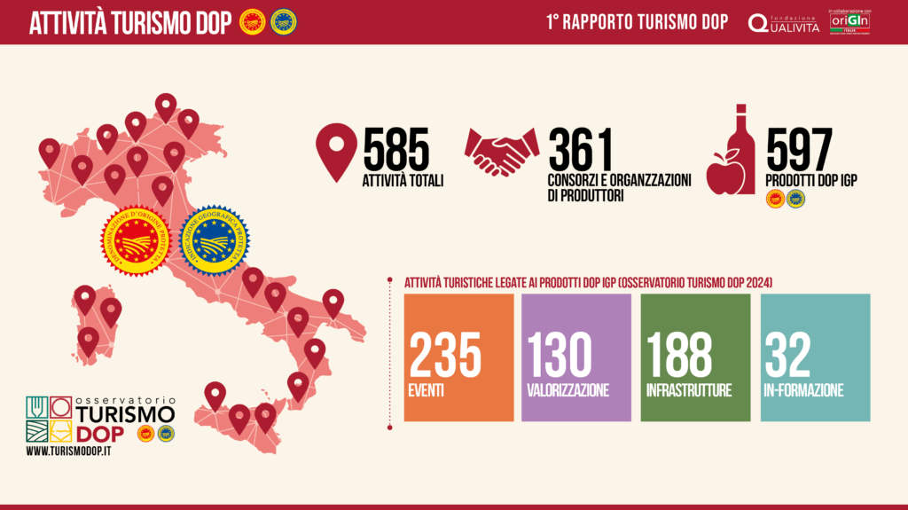 Secondo il Rapporto, in Italia sono attualmente attive 585 iniziative turistiche riconducibili alle DOP e IGP. Di queste, 235 sono eventi temporanei: degustazioni in cantina, visite guidate in caseifici, festival culturali, attività sportive legate alle produzioni certificate. L’ambito degli eventi si conferma il più dinamico, capace di coinvolgere un pubblico ampio e variegato. A queste si affiancano 188 infrastrutture permanenti, tra cui le Strade del Vino e dei Sapori riconosciute dalle Regioni, musei del gusto, centri didattici e presidi culturali che consolidano l’esperienza nel tempo e nel territorio.