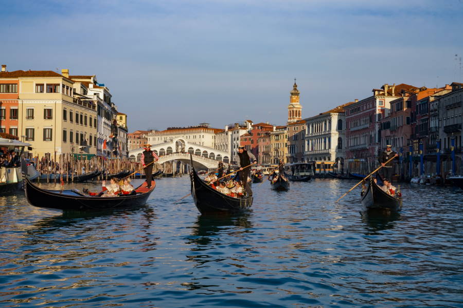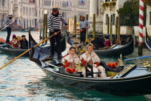 Tra questi, la Festa delle Marie resta uno dei momenti più identitari e riconoscibili: non una semplice rievocazione storica, ma un racconto collettivo che Venezia rinnova ogni anno, ricordando le proprie origini e il valore simbolico della comunità. Sabato 7 febbraio le dodici Marie fanno la loro prima uscita ufficiale, come da tradizione sull’acqua, con un corteo di gondole che parte da Santa Sofia e percorre lentamente il Canal Grande. È un movimento misurato, quasi solenne, che dialoga con l’architettura della città, con la luce invernale e con lo sguardo di chi osserva dalle rive, restituendo un’immagine che appartiene tanto alla storia quanto all’immaginario veneziano. Lo sbarco in Piazzetta San Marco segna il passaggio alla dimensione pubblica e cerimoniale: qui le Marie vengono accolte dal corteo dogale del Consorzio Europeo Rievocazioni Storiche, tra armigeri, musici e costumi d’epoca, prima della presentazione ufficiale sul palco e della foto di rito delle ore 16, che sancisce l’inizio del loro percorso carnevalesco fino alla proclamazione finale.