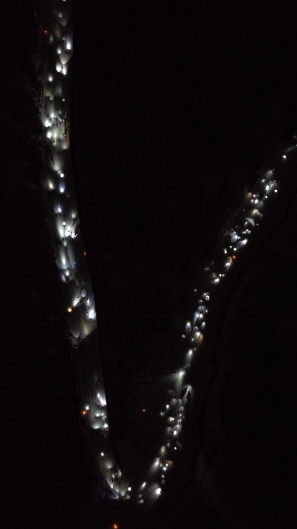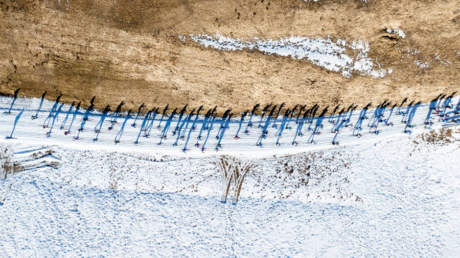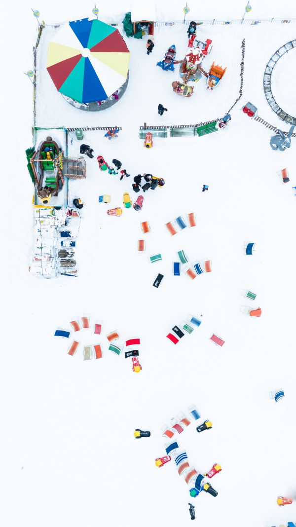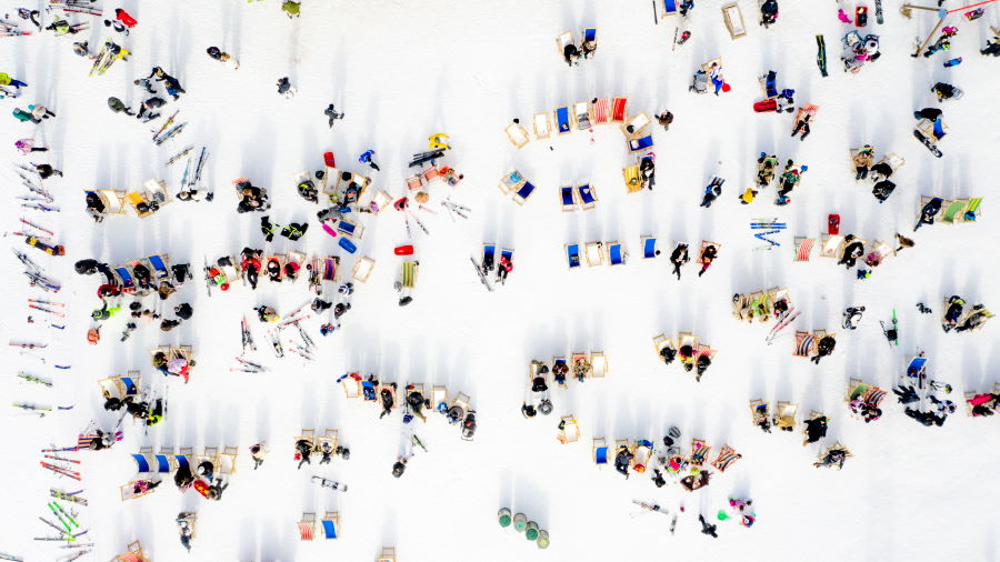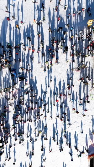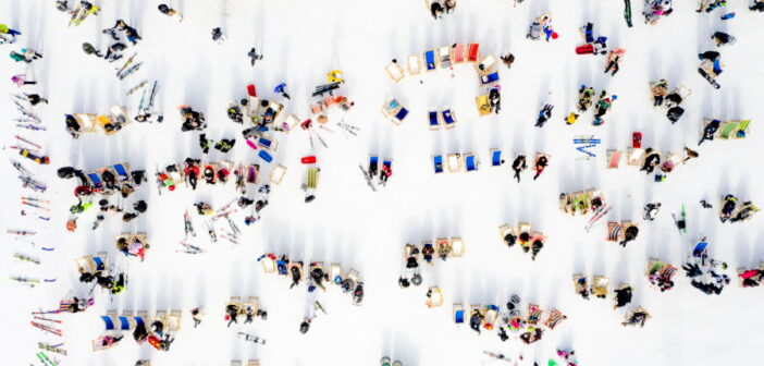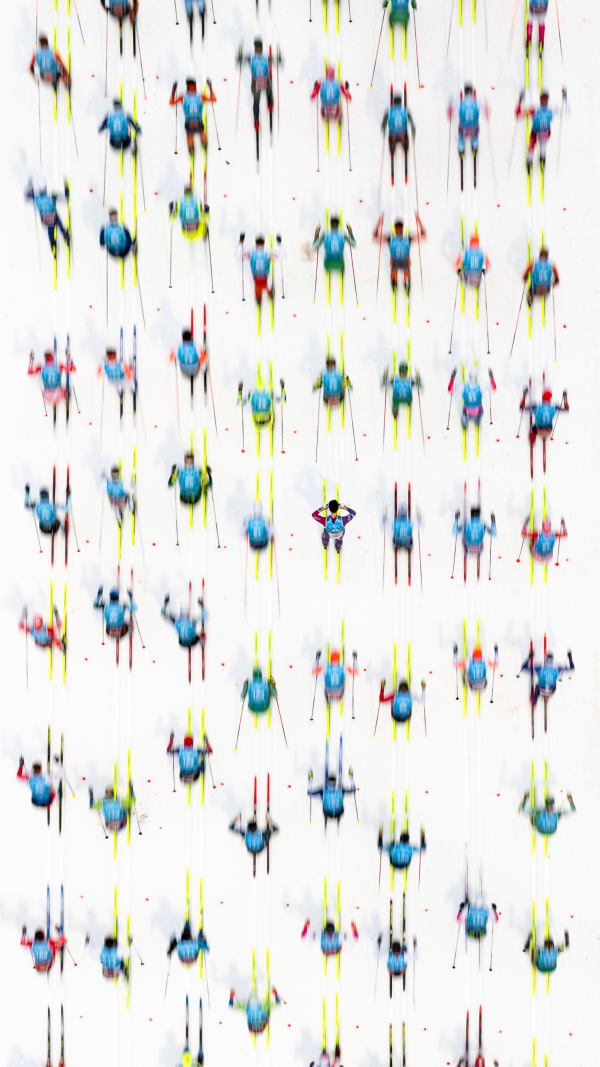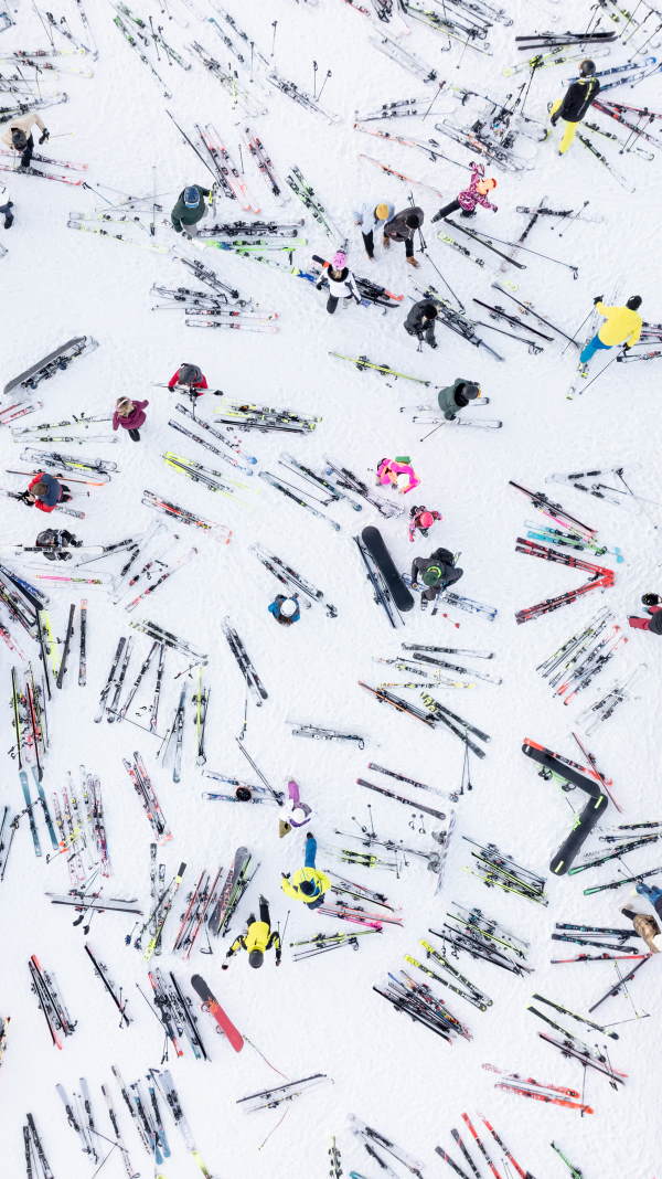 Curata da Massimo Ciampa, la mostra presenta con un dialogo tra arte, fotografia e sostenibilità la montagna in un percorso di 23 fotografie zenitali (vista “a volo d’uccello” dall’alto verso il basso) in grande formato, realizzate con droni tra Monte Bianco, Alpe di Siusi, Val di Fassa, Val Badia, Roccaraso, Cortina d’Ampezzo e Madonna di Campiglio: il manto nevoso – prima bianco poi attraversato da figurine che divengono sempre più grandi tanto da costituire una folla – si fraziona in trame sconnesse a causa di un continuo andirivieni di irrispettosi che feriscono il paesaggio dissolvendone la purezza.
