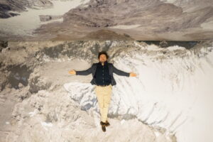 Cosa si è fatto per salvare montagna e ghiacciai che stanno arretrando in modo vertiginoso? È stata istituita la Giornata Internazionale della Montagna l’11 dicembre et similia, ma buona parte dell’umanità non conosce il problema o lo nega anche a livello politico… Su questi temi verte l’opera site- specific dell’artista che su una gigantografia di delicata carta fotografica, estesa anche sul pavimento, ha fatto stampare il Monte Bianco – mito europeo e alpino e nel passato per la sua inaccessibilità soprannominato Mont Maudit, ‘Monte Maledetto’ fino al 1786 quando Jacques Balmat e Michel-Gabriel Paccard raggiunsero la cima inaugurando l’alpinismo moderno – con il ghiacciaio della Brenva (in patois valdostano larice a indicare i boschi che crescevano alla sua base), quarto ghiacciaio della Val d’Aosta e cascata di ghiaccio più alta delle Alpi. Ormai in forte regresso, la Brenva si vede in alto diversamente dagli anni ’60 quando ci si recava alla chiesetta di Notre Dame de Guérison – allora prospiciente al ghiacciaio – per vedere il ghiacciaio e le slavine che a volte si staccavano dalla parte frontale. Nell’installazione si cammina sulla foto del ghiaione alla base della Brenva rovinando la carta: simbolo del degrado dei vari colossi di ghiaccio… un’esperienza che fa riflettere!